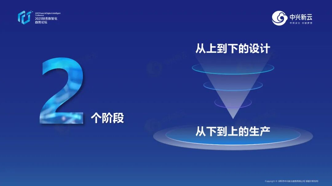 1个驱动:经营管理从流程驱动向数字驱动转变 ![]() 今年春节伊始,以 DeepSeek 为代表的国产开源大模型受到广泛关注,并在短时间内实现企业级的成熟应用,这一发展给许多行业都带来了显著影响。一方面,令人惊喜于大模型为工作与生活带来的便利;另一方面,也引发了对未来冲击与挑战的焦虑。 大模型之所以具备推理、分析并生成内容的强大能力,其根本原因在于以Transformer为代表的神经网络架构取得了关键性突破。正是这一创新架构与海量高质量数据的深度融合,才使得大模型涌现出前所未有的能力。当前领先的大模型几乎都是在万亿级token规模的高质量数据上训练而成,数据成为大模型能力构建的主要驱动力量。 事实上,不仅仅是大模型,一切高级形态的自动化与智能化,其本质都依赖于数据驱动。财务工作天生与数据打交道,其数据驱动的特征也尤为突出。2022 年,国务院国资委在《关于中央企业加快建设世界一流财务管理体系的指导意见》中明确提出,企业经营管理与财务管理应实现从流程驱动向数据驱动转变,从经验主导向模型、算法主导转变。未来财务的职责在于支撑战略、支持决策。在这个过程中,无论是宏观长期战略,还是微观短期事项;无论是决定做什么、不做什么,抑或是什么都不做,都属于决策行为,都需要数据、算法和模型作为支撑。 此外,文件还强调,财务需做好风险管控。近年来,风险管理一直是国资委财务工作的重点,从最初“司库监管”到全面的财务“智慧监管”,再到“穿透式监管”,风险管控工作不断深化。这几类监管方式核心逻辑一致:针对所关注的问题,确立相应评价指标,建立模型、算法与阀值,再通过数据校验以识别风险。 在国资委推进司库监管的过程中,中兴新云协助设计了100多个模型及相关规则与算法,实现了全面的资金风险监控。在接下来的穿透式监管中,也将开展类似工作。由此可见,风险管控最终依赖的也是数据,未来,财务工作的最大需求就在于数据、模型与算法,因此财务共享中心还有另一个定位,即财务的“大数据中心”。 2个阶段:从上到下的设计,从下到上的生产